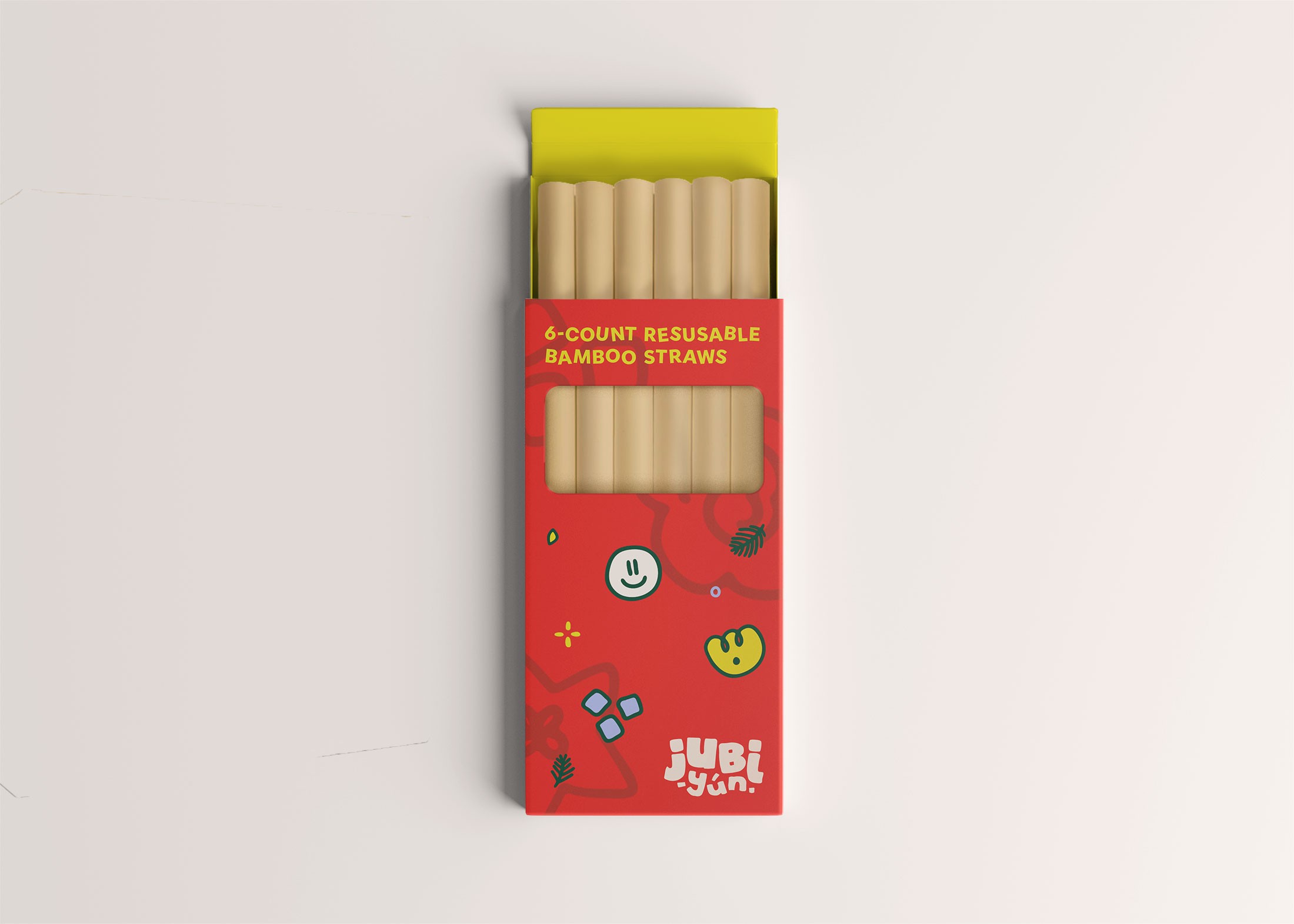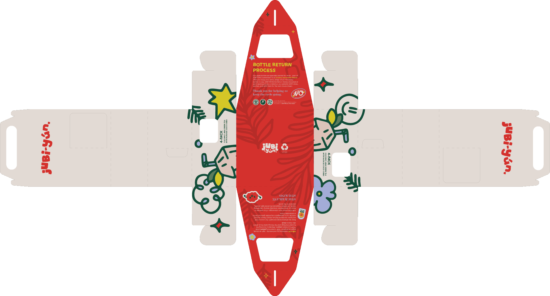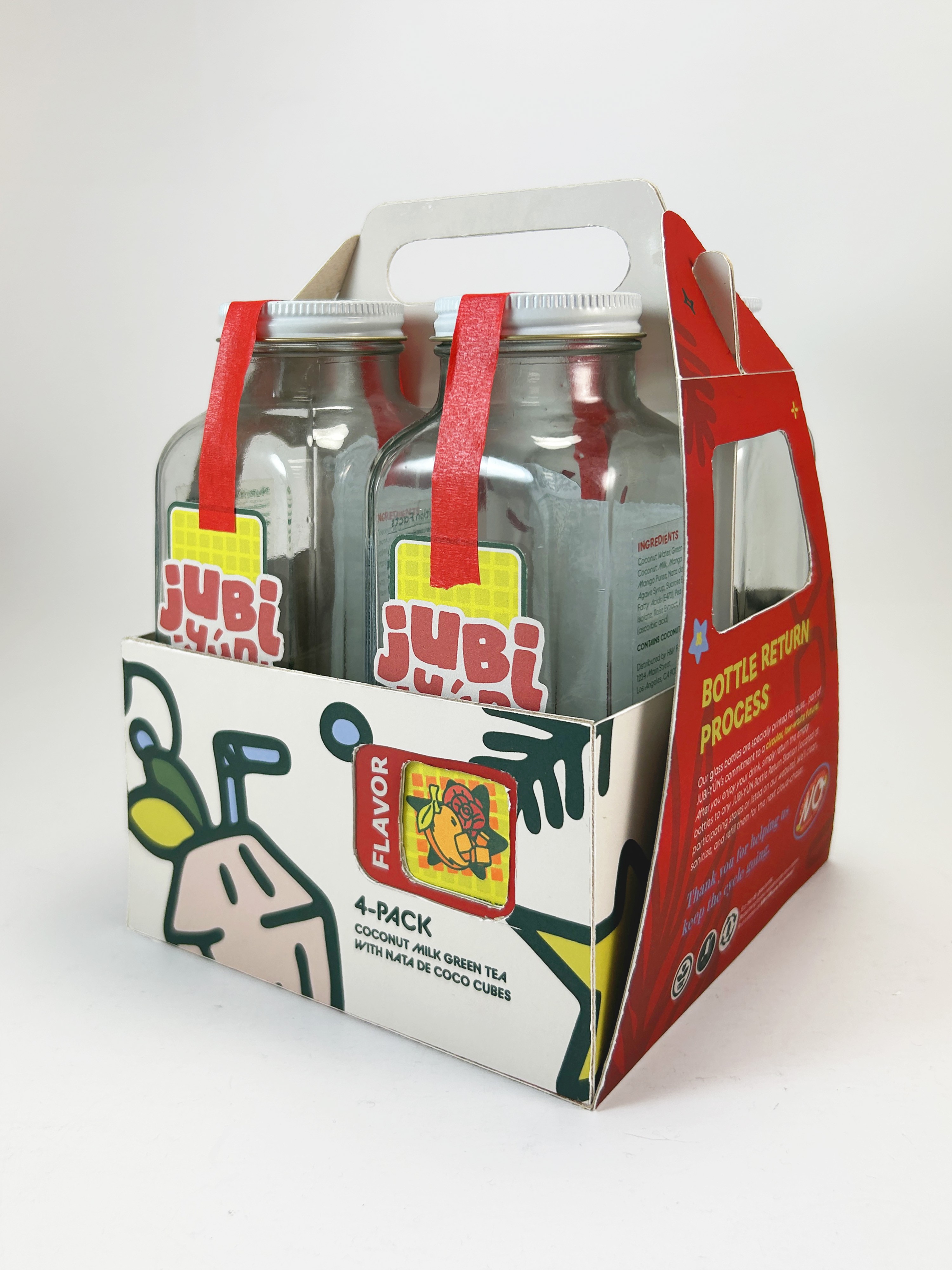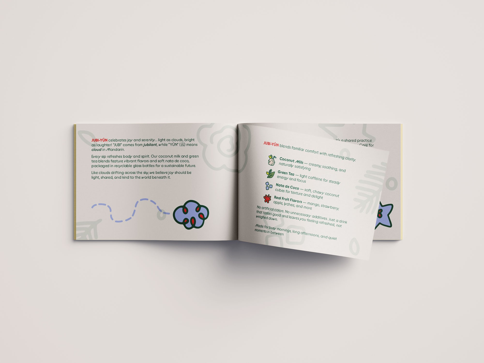 The Jubi-Yún logo is designed to feel playful, soft, and approachable, using rounded, inflated letterforms that echo the light, bouncy texture of nata de coco. Its irregular, hand-touched forms introduce a sense of spontaneity and joy, aligning with the brand’s focus on small, uplifting moments in everyday life.