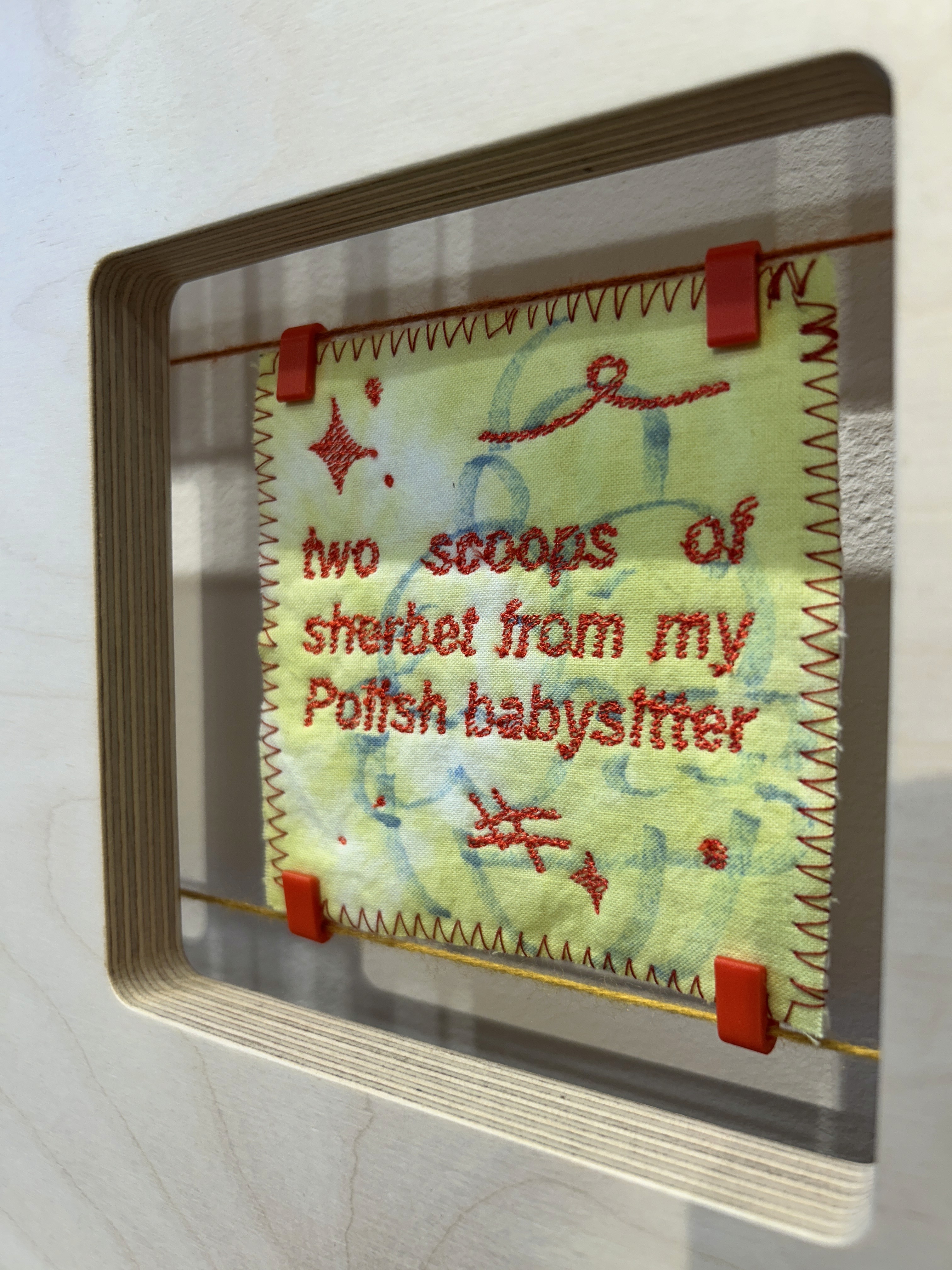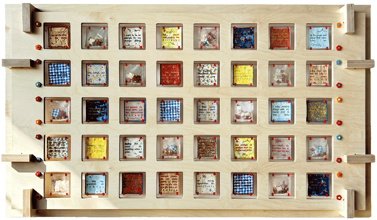 The installation brings together 30 anonymous, machine-embroidered narratives about memory, family, and identity, suspended within a structured wooden frame. Each fragment holds a deeply personal story, while the system as a whole reveals patterns of shared grief, joy, and resilience. By combining fiber practices with digital fabrication, the work bridges intimacy and structure, emphasizing both individuality and interdependence.